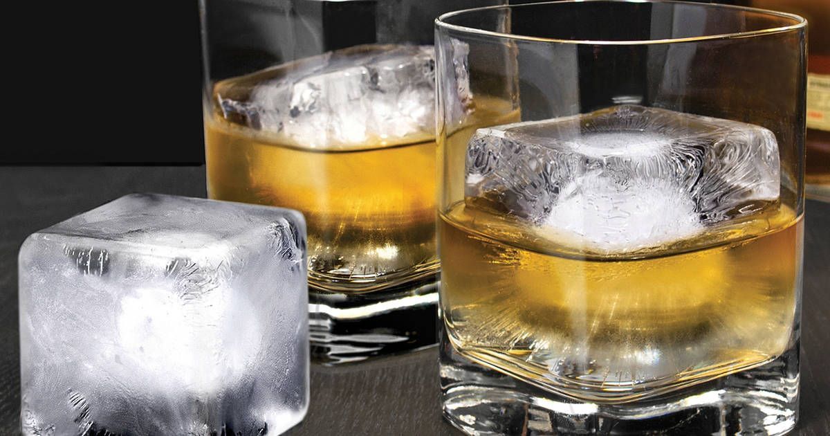 - Крепкий алкоголь. Виски, ром или бурбон со льдом — классика. Один крупный куб или шар тает медленно и не портит вкус напитка.