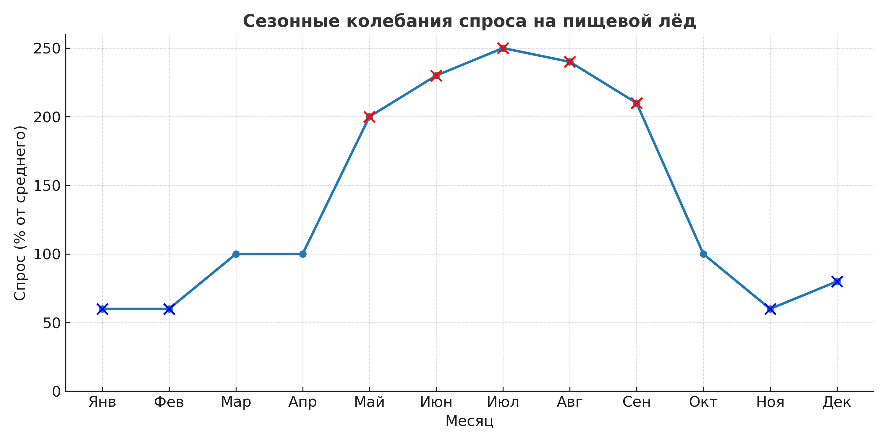 - Температура и климатические условия. При среднесуточной температуре выше +20 °C потребление льда растет. Пик — в периоды жары от +28 °C и выше.